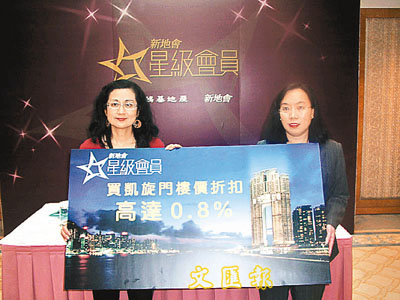 新地會董事總經理劉美梅(左)與謝文娟介紹「星級會員」計劃,凱旋門成為首個獲優惠樓盤。 (梁悅琴 攝)