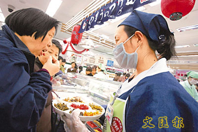 中日合資華堂超級市場北京第五分店,未受近日京城民間反日情緒影響,按計劃開張營業。圖為北京市民在店內嘗試日式食品。 (法新社)