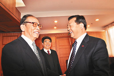 周南與本報社長張國良談笑風生。 (本報記者北京傳真)