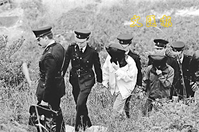 張有恆(前)當年被捕後曾與尹三龍(右)被警方押返寶馬山雙屍案現場調查。(資料相片)