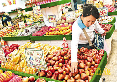 傳內地12項水果將對台灣開放,台灣水果有望首次直接進入大陸市場。圖為一位台北婦女正在當地超市挑選本土種植的水果。 (美聯社)