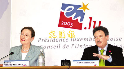 【本報訊】綜合新華網及香港中通社17日報道:為期兩天的歐盟外長非正式會議16日在盧森堡閉幕。歐盟輪值主席國盧森堡外交大臣阿塞爾博恩在會後的記者招待會上強調,歐盟輪值主席國仍希望在今年6月底前就有關對華軍售解禁問題達成一致。