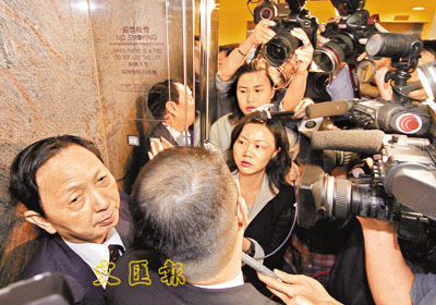 張耀榮到海洋皇宮酒樓與工會代表開會後離開,被大批記者包圍追問結果。(羅蘭蓉 攝)
