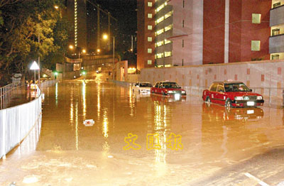 洶湧食水混雜沙泥,淹沒一段馬路,水深一度深近兩呎。停泊路旁兩部的士及一輛私家車被水包圍,車輪全部陷入泥水中。洪水沿黃大仙道下斜,衝入普善樓地下,再沿梯級傾瀉而下,狀如瀑布奇觀,並繼續湧向啟善樓。