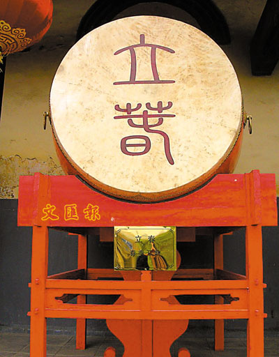 鼓一般有三種:設在譙樓上的「更鼓」,設在大堂內的「堂鼓」,掛在大門屋簷下的「門鼓」或俗稱的「喊冤鼓」。更鼓用來報時,古代將日落至日出的夜晚平均劃為五個時段,每一段為一「更」,合稱「五更」,每更的時間按照季節而不同。每天晚上轉更之時,就要擂一通更鼓報時。大堂裡的堂鼓掛在一個高高的鼓架上,用來宣佈長官升堂問事、退堂回衙。門鼓並非每個州縣衙門都設,有的衙門改掛一面銅鑼,也有的是什麼也不掛,就憑當事人大聲「喊稟」。就是設了門鼓也是不讓人隨便擂打的,「無端擊鼓,驚擾聽聞」,是要被打一頓的。