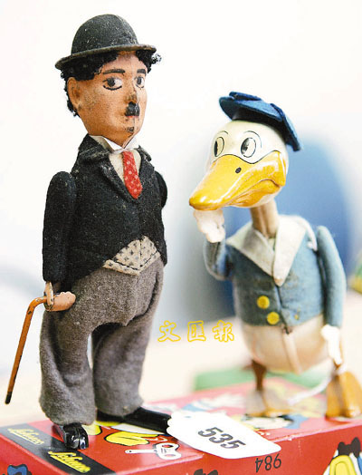 差利卓別靈心想:「唐老鴨,你在看甚麼?在看我的鬍子?」它們在倫敦拍賣會上踫頭,均在二戰前德國Schuco玩具廠出生。(美聯社)