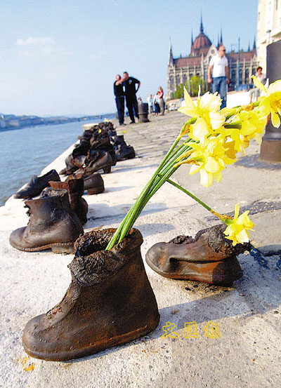 60對當代的鞋子被匈牙利雕刻家Gyula Pauer鋪上鐵層,延綿多瑙河邊,紀念二次大戰被國內納粹黨槍擊墜河的猶太人。 (美聯社)