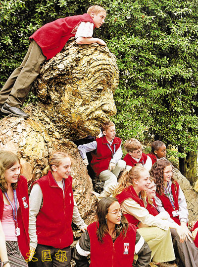 出席領袖講座的學生們,在美國華盛頓國家科學學院的愛因斯坦像前擺甫士,一個更如猴子爬樹般爬上他頭上;他們心目中的領袖是甚麼模樣? (美聯社)