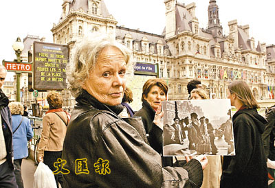 這名白髮女人,以前是法國女星,名叫Francoise Bornet。她手持著的,是一幅時代經典照片《大會堂前之吻》複製品;55年前在巴黎大會堂前,她和他的吻被凝定,不斷被複製被挪用。55年後,她將真跡掏出來拍賣,預計價值15,000歐元以上。 (美聯社)