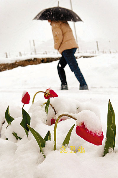 紅色鬱金香垂著頭,被厚雪覆蓋,猶在負重。今年瑞士西部和中部雪很大,積雪達20厘米。(美聯社)