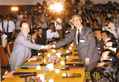 1993年大陸海協會會長汪道涵與台灣海基會董事長辜振甫在新加坡會面,「汪辜會談」揭開兩岸關係新一頁。
