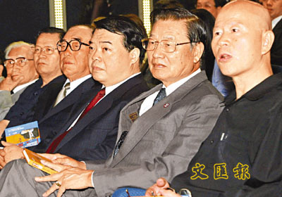 已故英業達集團副董事長溫世仁(右3)年前在台北舉行《中國經濟的未來》新書發表會,邀得江丙坤(右2)、郝柏村(左3)、許信良(右)等人出席。(中央社)