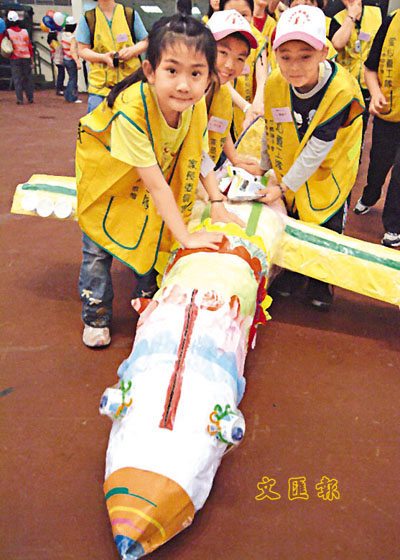 桃園縣23日舉行千人義工團體大會師活動,其中小學生的義工團體利用各式瓶罐做成模型飛機,深具創意。(中央社)