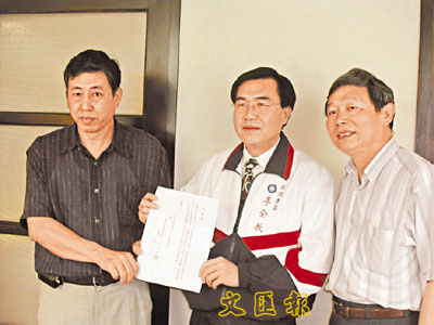 台南縣農會理事長洪木華(左)23日代表全縣鄉鎮市農會送交授權書給國民黨籍「立委」李全教(中),由國民黨和大陸商談台南縣農產品登陸事宜。(中央社)