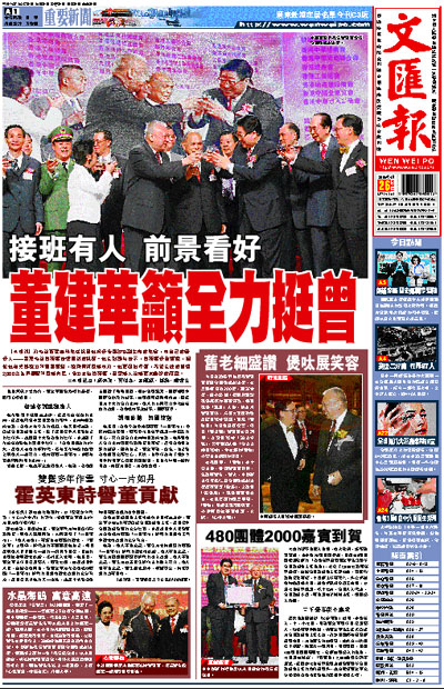 【本報訊】前特首董建華昨晚借祝賀他榮任全國政協副主席的晚會,向自己的繼任人——署理特首曾蔭權表達真誠的祝願。他在致辭時表示,曾蔭權任重道遠,相信他有卓越能力和豐富經驗,能夠帶領香港向前。他更發出呼籲,希望在座的超過2,000名各界嘉賓和香港市民,全力支持曾蔭權,書寫港人治港更加美好的篇章。