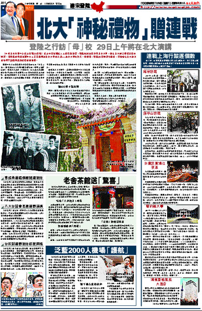 同時,連戰29日上午在北大的演講也相當引眾人關注。北大有關權威人士今日向本報透露,辦公樓禮堂最多可容納800人,屆時將有400餘名北大學生在現場聆聽連戰演講,其中包括數名台灣學生,其餘則留給部分北大教師及海內外記者。另外,作為連戰演講地的辦公樓禮堂目前已部署警衛輪流看守,只有相關負責人才能進入。