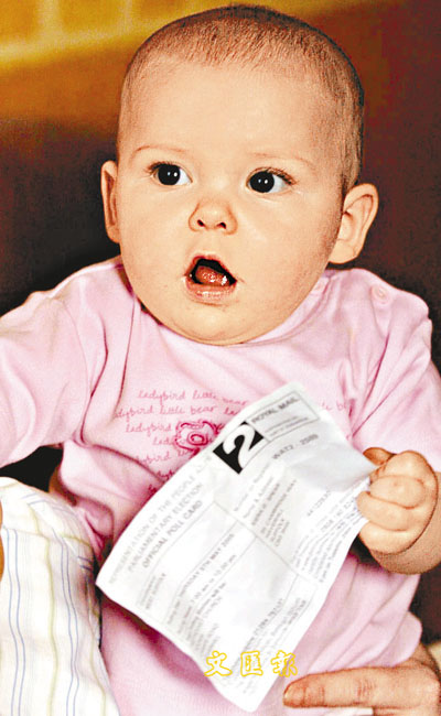 8個月大的英國嬰兒斯皮爾手持即將舉行的英國大選選民登記咭。該登記咭是英國政府誤發給這名嬰兒的。(美聯社)