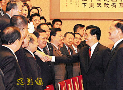 隨後,胡錦濤來到人民大會堂東大廳,會見中國國民黨大陸訪問團全體成員並合影。