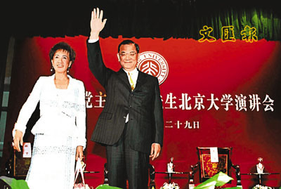 連戰夫婦在演講台上向北大師生致意。(本報北京傳真)