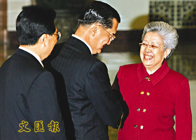 吳儀副總理與連戰握手。 (美聯社)