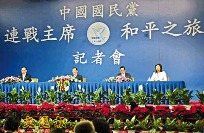 連戰昨晚在北京飯店舉行和平之旅記者會。 (中新社)