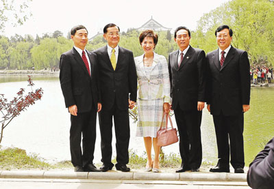連戰(左二)攜夫人﹐在北京大學未名湖畔留影。左一為北大校務委員會主任閔維方、右一為北大副校長郝平、右二為中台辦主任陳雲林。 (中新社)