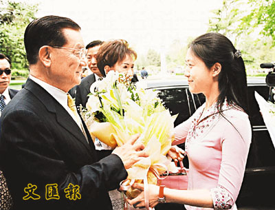 北大學生向連戰獻花歡迎。 (本報北京傳真)