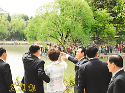 在春光爛漫的未名湖畔,連戰與夫人下車留影,尾隨而至的北大學生很快便佔據了有利地形,湖心小島,隔湖向對岸的連戰「喊話」。「連哥加油!」,「連主席好!」隨著對岸此起彼伏、一潮高過一潮的呼喚,連戰再也顧不得留影,轉過身來,向彼岸的學生揮手致意,並以一聲「同學們好」熱切回應。但無耐隔水相望,惟有與夫人頻頻揮手以表謝意。