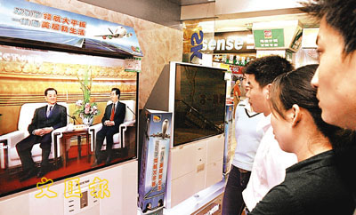 29日下午,在安徽省宿州市一家商場內,人們在觀看胡錦濤與連戰會談的電視直播。 (新華社)