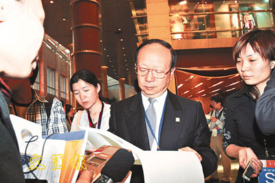 國民黨中常委蔣孝嚴幫助記者解讀國共兩黨新發表的《聯合新聞公報》。(本報記者攝)