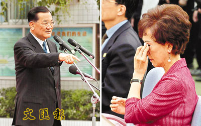 連戰在後宰門小學講到祖母的去世時,連戰夫人方瑀不禁傷心落淚。 (新華社)