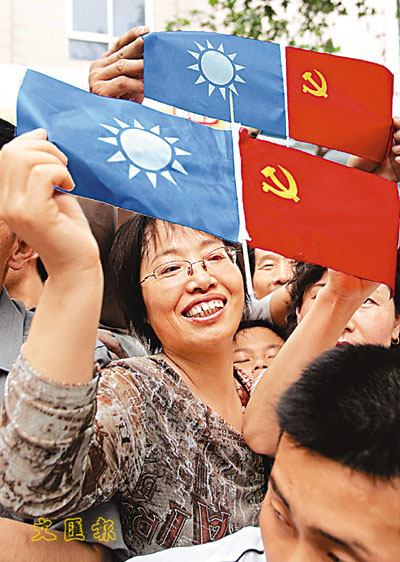 西安市民揮動國共兩黨旗幟歡迎連戰到訪。 (美聯社)
