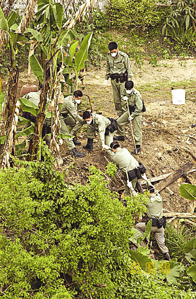 大批機動部隊警員在豬場附近山坡搜索證物。