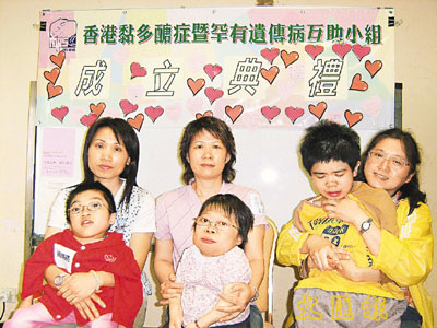 「香港黏多醣症暨罕有遺傳病互助小組」內也有「黏多脂症」及「肝醣積儲症」病友。「黏多脂症」患者黃詠勤,從外表很難看出她已經23歲,因為「黏多脂症」影響,令她的骨骼停止生長,關節也變得僵硬。此病更令她在社會上處處碰壁,「小學唔收我,連私校都唔收,後來要搵村校才有書讀。