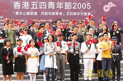 以「青年心繫家國、共創和諧香港」為主題的香港五四青年節2005由前夜晚會揭開序幕後,昨日進入活動最高潮,由早上的「第8屆青年成人禮」,到中午在金紫荊廣場舉行「五四青年大巡遊」,還有下午在灣仔運動場舉行的「五四青年大匯演」,都吸引無數市民、遊客佇足欣賞及參與其中,他們更認為活動饒有意義,能夠發揚青年的愛國熱情及民族意識。全國青聯代表團團長王曉是次專程率領「才俊團」,包括神舟5號航天工程總指揮袁家軍、桌球冠軍丁俊暉、世界小姐季軍關琦、鋼琴家孔祥東、民歌演唱家王宏偉和著名歌唱家解小東等,與香港青少年分享心得,並帶來精彩的高水準演出。