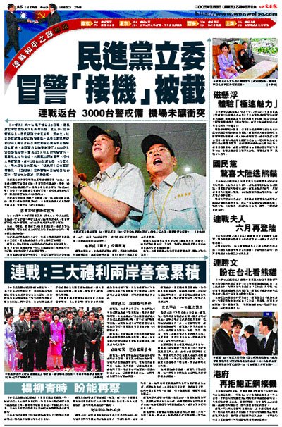 【本報訊】據中時電子報台北3日電:國民黨主席連戰結束大陸訪問行程,晚上7時30分返抵台北,國民黨副主席王金平、馬英九,以及多位黨籍立委在機場迎接。為防止藍綠陣營的政治人物及支持者可能再度在桃園中正機場發生衝突,台灣警方在機場部署了3,000多名警力維持治安,並禁止3人以上的集會遊行。截至晚上10時為止,共攔截23輛遊覽車,將14人帶返警局,其中3位為執政黨立委、4名黑衣人,幸未發生重大事端。「總統府」公共事務室表示,「副總統」呂秀蓮對中正機場發生的事件,警力執法過當,深表遺憾。