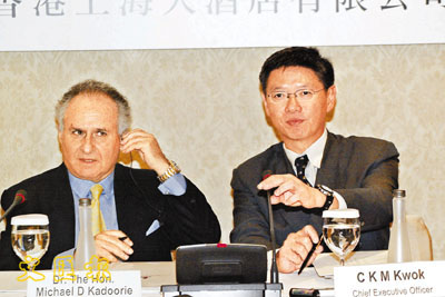 郭敬文(右)表示,凌霄閣出租率及租金下調,主要受翻新工程影響。旁為主席米高.嘉道理。 (張偉民 攝)