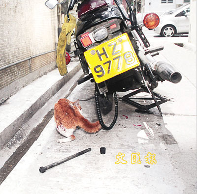 【本報訊】一隻小野貓昨疑因貪睡險喪命車輪下!牠昨午在旺角花園街一處後巷,躲入一輛電單車的後輪與沙板間空隙睡覺,其後當車主甫開車之際,小貓慘被卡住,幸善心車主找來修車師傅,拆開車輪,為小貓脫險,牠遂由愛護動物協會人員帶走治理。