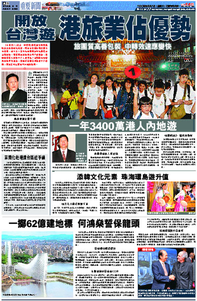 【本報訊】(記者 林賽香)國民黨主席連戰破冰之旅圓滿完成後,兩岸交往逐步朝正面方向發展,其中之一是內地有意開放內地居民赴台灣旅遊。隨著兩岸旅遊業之門不斷開啟,香港會否喪失旅遊中介人的角色?台灣觀光協會與旅遊界均認為,香港仍是舉足輕重的中介橋樑,兩岸正常化更有利本港旅遊業。