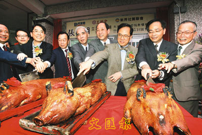 曾蔭權出席張學明天水圍辦事處開幕禮,與主人家及一眾嘉賓齊切燒豬。 (潘達文攝)