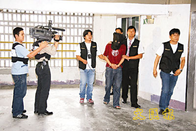 警員押送兇殺案疑犯返回現場案情重組。(蔣焯文 攝)