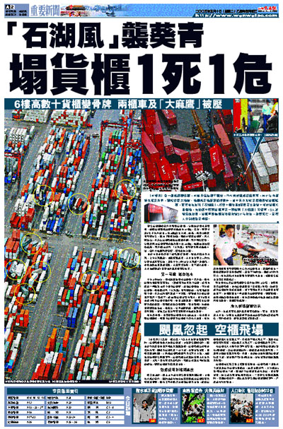 【本報訊】受一股低壓槽影響,本港天氣持續不穩定,昨午突然颳起狂風暴雨,半小時內橫掃九龍及新界,釀成近百宗塌樹、塌棚架及塌簷篷招牌意外,其中青衣九號及葵涌四號貨櫃碼頭,更罕有地出現「石湖風」,將數十個堆至6層樓高共重逾十噸的貨櫃吹至倒塌,先後壓中兩輛貨櫃車及一輛俗稱「大麻鷹」吊臂車,3人當場浴血被困,貨櫃車司機經消防拯救逾3小時救出,證實死亡,另兩人分別危殆及輕傷。