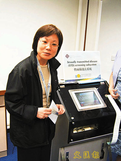 「性病篩選次系統」,一按掣,自動有信封及一枝針筒供用家抽取陰道樣本,放入機後,由職員收集,4天後便有分析結果。
