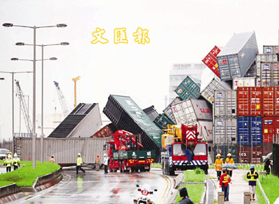 數十貨櫃橫七豎八插在路中。 (溫瑞麟 攝)