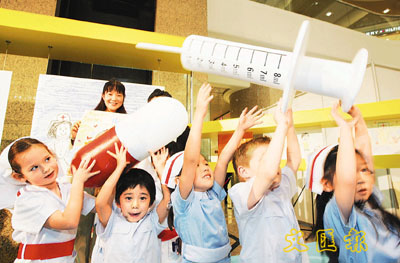 今天是國際護士節,一班國際學校的小朋友扮演小護士,表演護士日常的工作。 (潘達文 攝)
