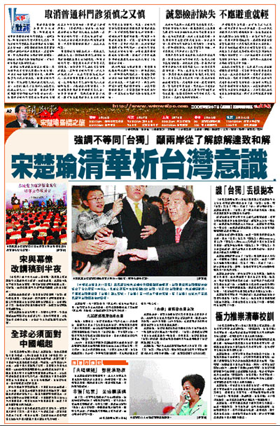 宋楚瑜表示,在與清華大學出身的胡錦濤總書記見面之前,他特地率親民黨大陸訪問團到清華大學,是要親自來目睹執中國科技牛耳的清華大學,並向清華師生致上無限的感佩之意。