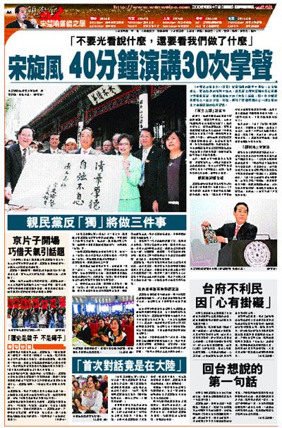 宋楚瑜還特意舉起事先準備的5月9日美國《新聞週刊》封面文章—《中國的世紀》來反映中國近年來突飛猛進的成就。他說:「現在是中華民族有史以來最繁榮富足的時候,也是中國人擺脫百年屈辱最關鍵的時刻。」「世界有多大,中國的機會就有多大!」