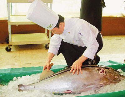 目前是鮪魚豐收時節,高雄一家餐飲業者12日推出新鮮鮪魚切割秀,讓消費者「鮮」嚐為快。 (中央社)