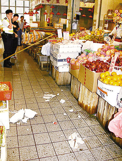 現場是港島華富h一期商場地下街市43至44號舖生果檔,昨午1時15分,陳姓老翁正在舖前揀選生果,其間,頭頂傳來一聲巨響,大量石屎碎片如雨散下,陳首當其衝,被碎石飛彈擊傷前額,血流如注,他負傷走進果檔躲避。
