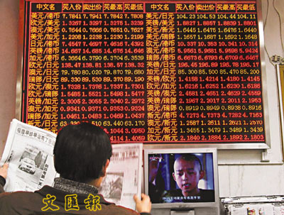 中國外匯交易中心正式開辦外幣買賣業務,是內地外匯市場首度融入國際市場。圖為北京一家銀行內的外幣交易報價牌。